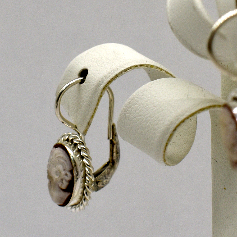 Oval-shaped pendant earrings, with carnelian shell cameo, depicting a woman’s profile, with 925/1000 silver cord setting.