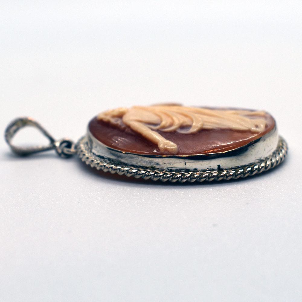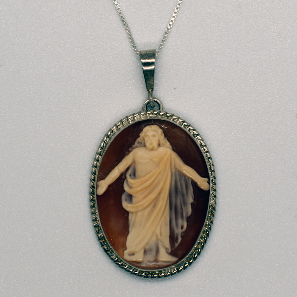 Ciondolo in argento 925/1000 con cammeo raffigurante Gesù, inciso su conchiglia Corniola, montatura CORDELLA